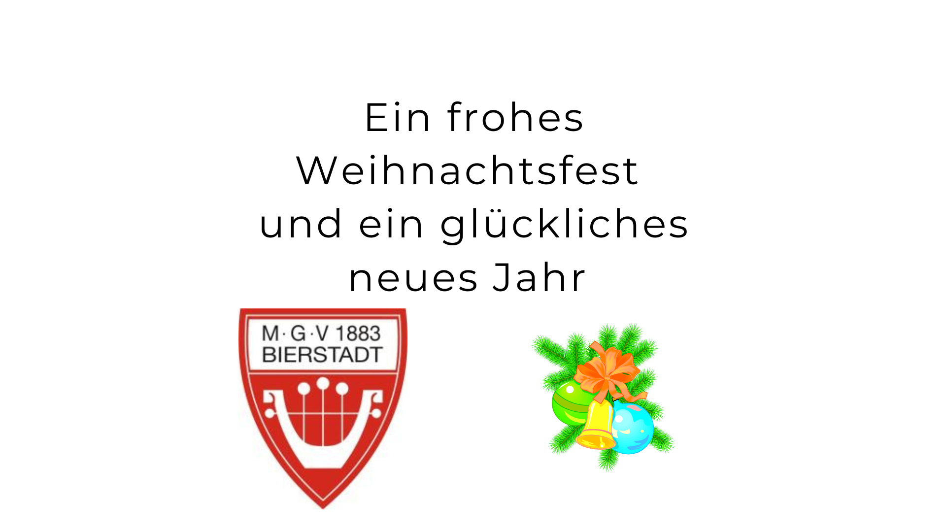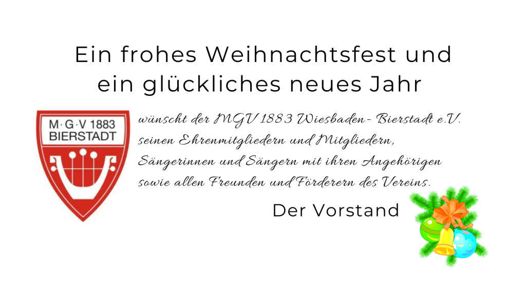 Ein frohes Weihnachtsfest und ein glückliches neues Jahr wünscht der MGV 1883 Wiesbaden-Bierstadt e.V. seinen Ehrenmitgliedern und Mitgliedern, Sängerinnern und Sängern mit ihren Angehörigen sowie allen Freunden und Förderern des Vereins.